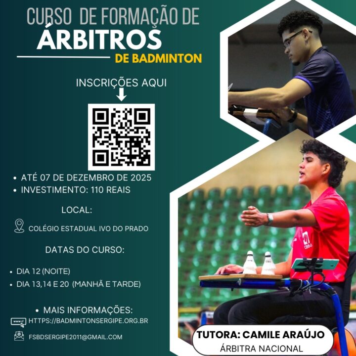 Se você é apaixonado por badminton e deseja atuar de forma mais profunda dentro do esporte, este é o momento perfeito para evoluir na sua trajetória. A Federação de Badminton de Sergipe está oferecendo o Curso de Formação de Árbitros, uma oportunidade única para quem deseja aprender, se capacitar e ingressar oficialmente no quadro de arbitragem. Toda a formação será conduzida pela experiência e conhecimento da árbitra nacional Camile Araújo.